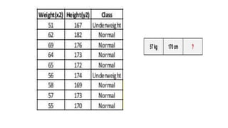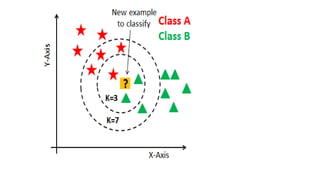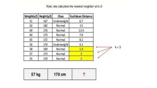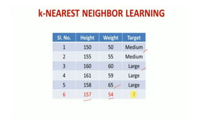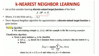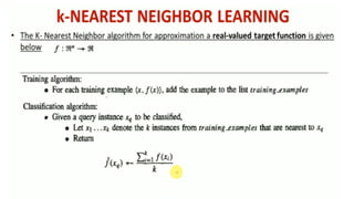 The document discusses various learning algorithms in machine learning, emphasizing instance-based learning and k-nearest neighbors (KNN). KNN is identified as a lazy, non-parametric learning algorithm used for classification and regression by comparing new instances with stored training data based on distance metrics. It also touches on case-based reasoning as a more complex approach to problem-solving by leveraging previous instances for decision-making.