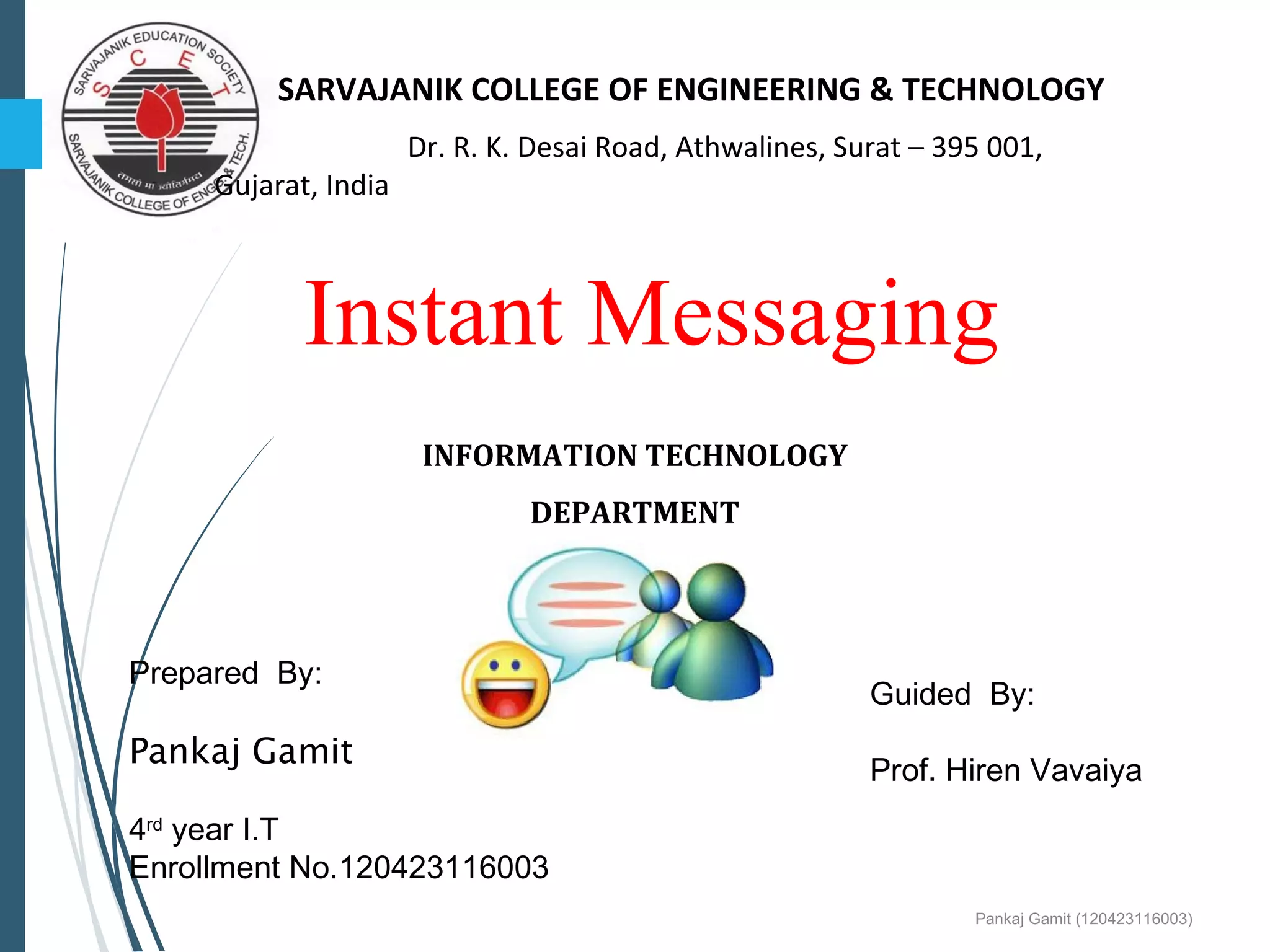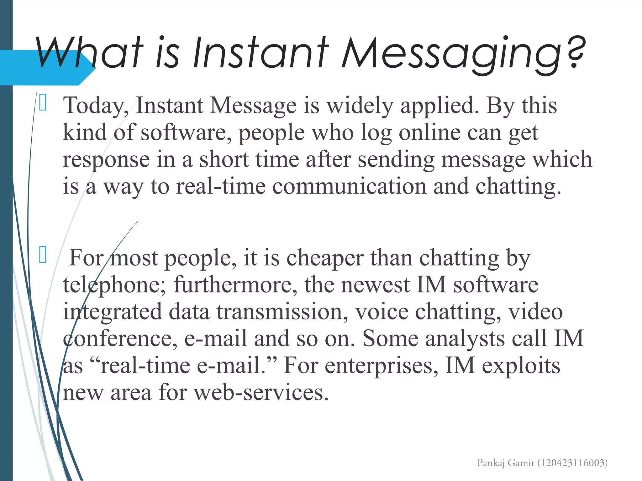 Instant Messaging is a form of real-time communication between users online. It allows users to see if contacts are available and chat with them instantly. While early instant messaging predated the internet on multi-user systems in the 1960s, it grew popular in the 1990s following predecessors like internet relay chat and multi-user dungeons. Instant messaging uses a client-server model where clients communicate with a server to locate other users and exchange encrypted messages. While useful for social and work communication, instant messaging poses security risks if not properly configured within an organization.