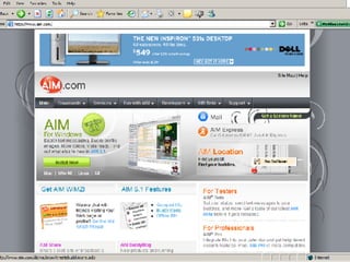 The document provides an overview of instant messaging (IM), including what it is, popular IM services, how to get started using IM, features like buddy lists and emoticons, security concerns, and how the Birmingham Public Library uses IM for reference questions. Popular free IM services mentioned are Yahoo, MSN, and AOL, which allow live text-based chats between internet-connected computers. Setting up an IM account involves choosing a service, downloading software, creating a username and password, and adding contacts to your buddy list.