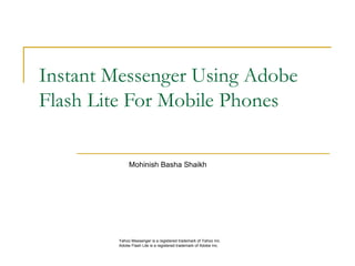 This document summarizes the development of an instant messenger client for mobile phones using Adobe Flash Lite. It describes building a Yahoo Messenger client app with features like login, buddy list, chat, and file transfer. Test cases are outlined for key features and screenshots are provided. The app was successfully tested on a Nokia N95 device, demonstrating Flash Lite's capabilities for mobile applications.