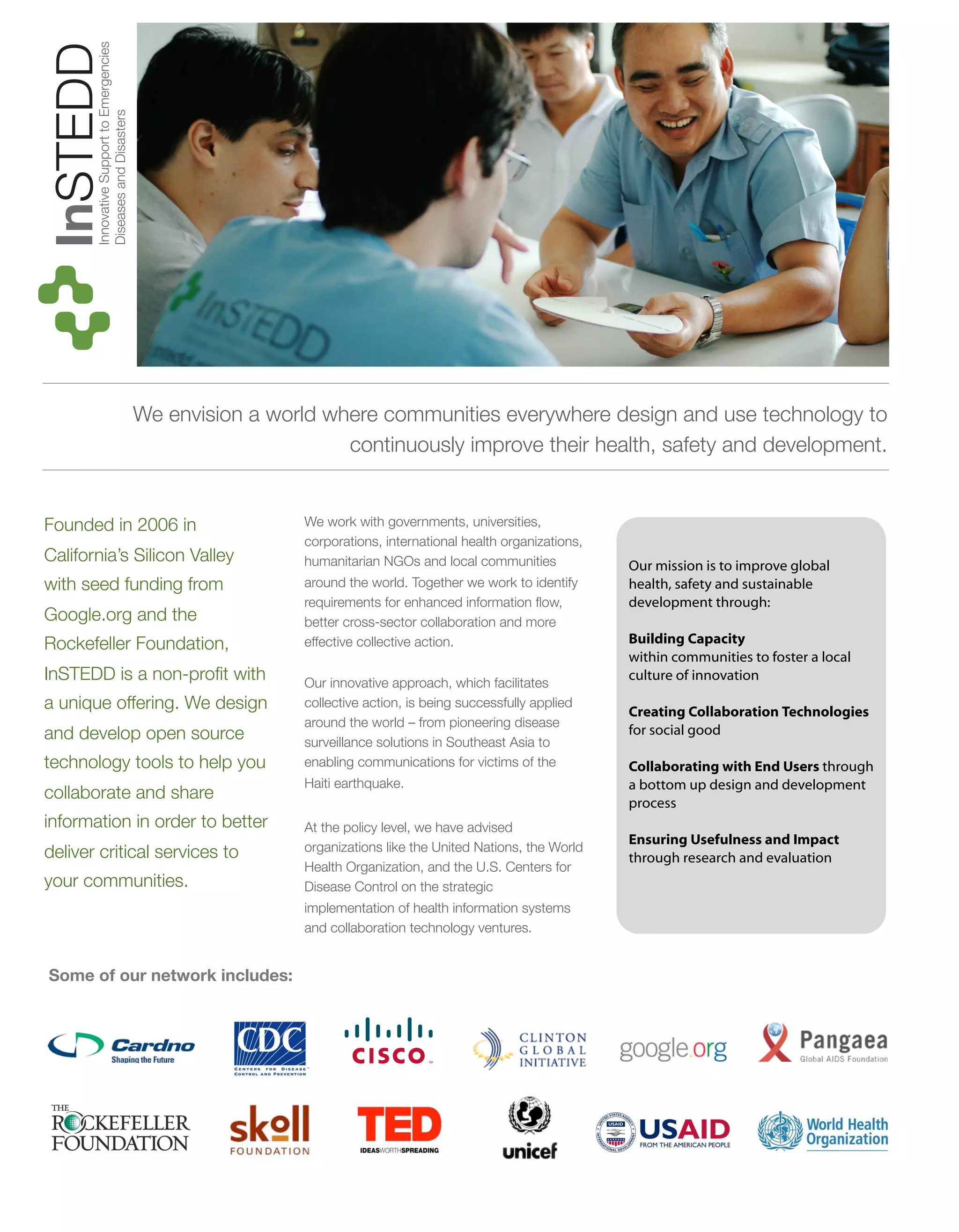 InSTEDD is a non-profit founded in 2006 that designs open source technology tools to help organizations collaborate and share information to better respond to diseases, disasters, and improve global health and development. It has innovation labs around the world that bring together experts to develop solutions tailored to local needs. Some of its tools include messaging applications, mobile data collection, and mapping and analytics platforms.