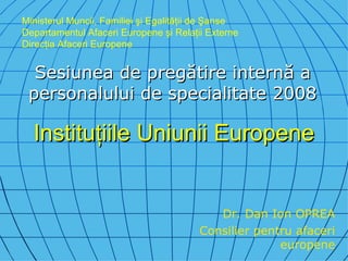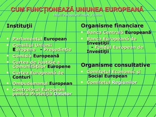 Documentul descrie structura și funcționarea instituțiilor Uniunii Europene, inclusiv Parlamentul European, Consiliul Uniunii Europene, Comisia Europeană și Curtea de Justiție a Uniunii Europene. Acesta evidențiază rolurile și responsabilitățile fiecărei instituții în procesul decizional și în gestionarea fondurilor europene. De asemenea, documentul detaliază organismele financiare și diversele agenții care sprijină activitățile Uniunii Europene.