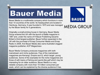 Bauer Media is a multimedia company founded in 1875 in Germany that now operates in more than 10 countries. It started as a small printing house and expanded into the UK in 1987. Bauer Media owns some mainstream magazines targeting young people like Kerrang! and Empire, as well as niche titles focused on topics for older audiences like fishing and golf. With over 19 million consumers per week, Bauer Media reaches a diverse audience through its variety of magazine titles.