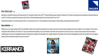 The first issue of Empire magazine was published in July 1989 by Bauer Media Group. It is published monthly and covers films through reviews, anniversaries, interviews and more. Kerrang! is a weekly music magazine first published in 1981 that covers both popular and smaller, less known bands through articles, interviews, posters and competitions. IPC Media was founded in 1958 and is the UK's leading consumer magazine publisher, producing magazines like Teen Now, Woman, and Marie Claire that reach over 26 million readers. EMAP was founded in 1947 and produces magazines focused on exhibitions and festivals like Architects' Journal and Nursing Times. The BBC also publishes magazines like RadioTimes, Top Gear, and Good Food in addition to its TV channels and