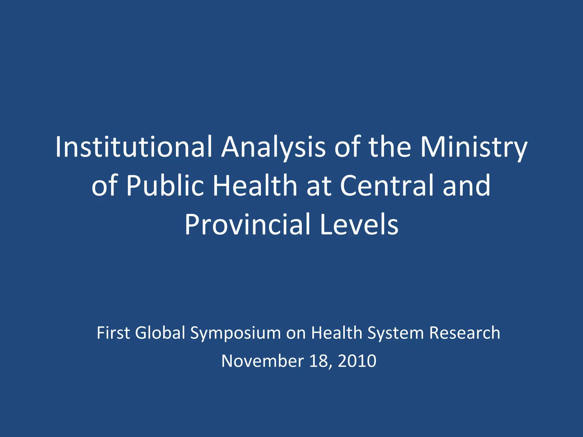 The document summarizes the findings of an institutional analysis of the Ministry of Public Health in Afghanistan at the central and provincial levels. It identifies strengths and challenges in key stewardship functions like setting strategies, developing technical guidelines, coordination, budgeting, monitoring and evaluation. It provides recommendations to address gaps in policies, guidelines, capacity and resources to help the Ministry strengthen its stewardship role over the health sector.