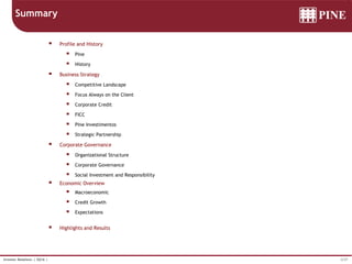 The document provides an overview of Pine bank including: