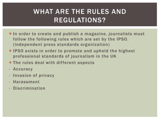 The document outlines rules set by the IPSO that journalists in the UK must follow when creating and publishing magazines. The rules cover accuracy in reporting, invasion of privacy, harassment, and discrimination. Specific rules prohibit publishing inaccurate or misleading information, using financial information for personal profit, photographing individuals without consent, harassing subjects, and making prejudicial references to people's attributes unless relevant.