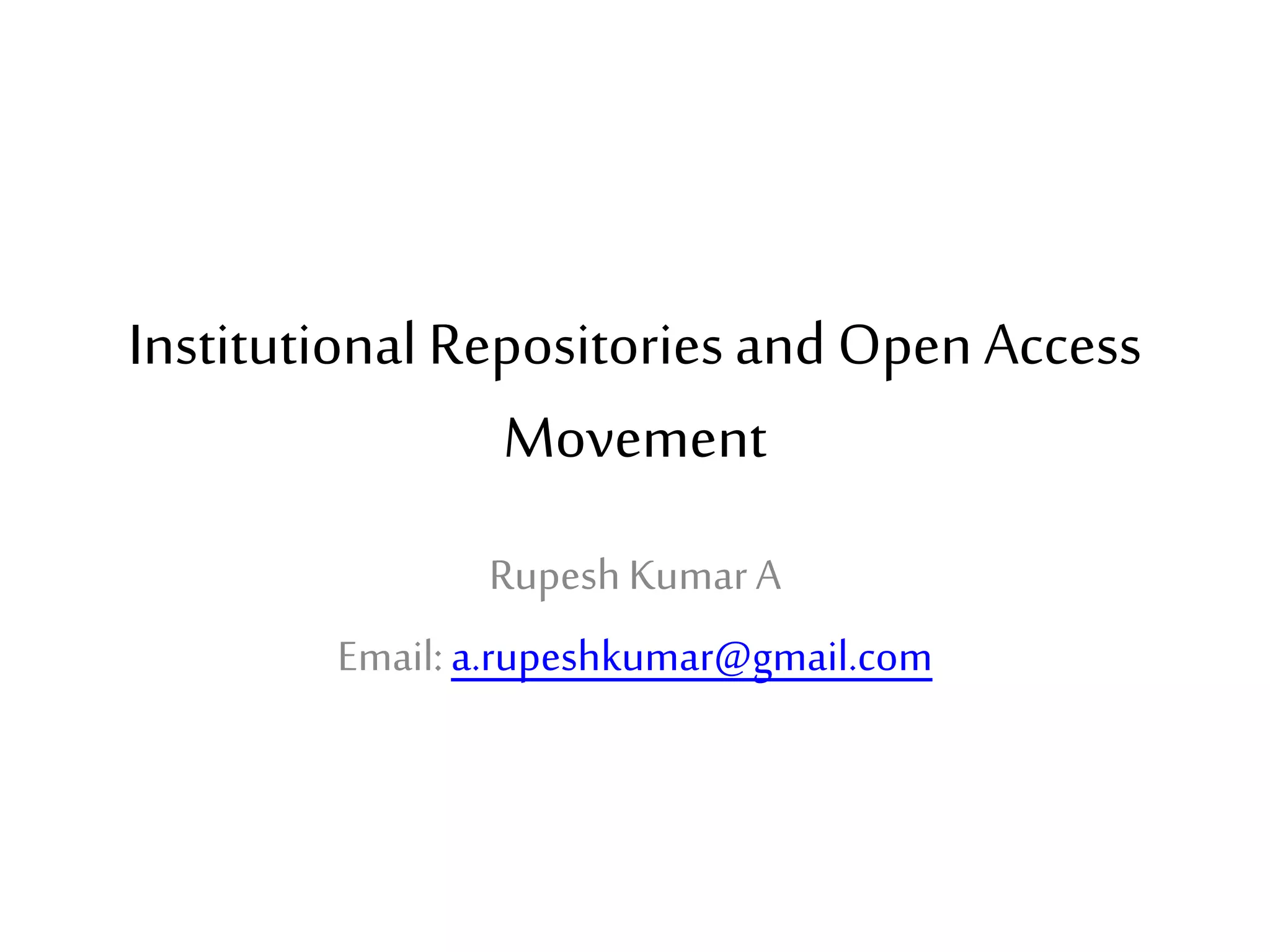 The document discusses institutional repositories (IR) and the open access movement, highlighting IR as a digital archive for managing and disseminating institutional intellectual outputs, which offer benefits such as expanded knowledge sharing and improved scholarly communication. It details various aspects of open access, including its definitions, advantages, and types like green, gold, and diamond access, as well as the history and key initiatives supporting the movement. Additionally, it lists notable advocates and organizations that champion open access, emphasizing the cooperative efforts to enhance scholarly communication globally.