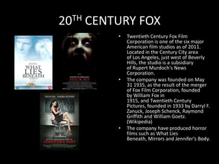 The document provides information on three major film studios: Twentieth Century Fox, Warner Bros., and Universal Pictures. It summarizes the founding and ownership of each studio and lists some examples of horror films produced by each, including What Lies Beneath and Mirrors by Twentieth Century Fox, Orphan and Final Destination 5 by Warner Bros., and The Strangers and The Unborn by Universal Pictures.