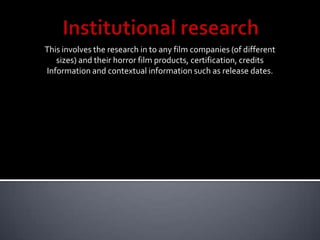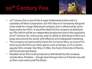 This document discusses research into film companies and their horror films. It focuses on 20th Century Fox, Hammer Films, and certification ratings. 20th Century Fox is a major Hollywood studio known for franchises like Star Wars but also distributed some horror films. Hammer Films was a UK company famous for Gothic horror films in the 1960s. Certification ratings aim to classify films by age groups to target appropriate audiences. The document also provides details about the production, distribution, credits and release date that would be researched for a hypothetical horror film called "The Black Forest."