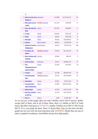 This document analyzes box office data for thriller films. It shows that thrillers made up half of the top 6 highest grossing films for the week listed. Overall, thrillers tend to have higher box office totals than dramas. The data also reveals that most successful thrillers are rated R, possibly due to violent content. Additionally, 20th Century Fox is identified as a company that has distributed several successful recent thrillers. The document recommends making a PG-13 thriller with a low budget and distributing it through 20th Century Fox to attempt to achieve high box office returns.