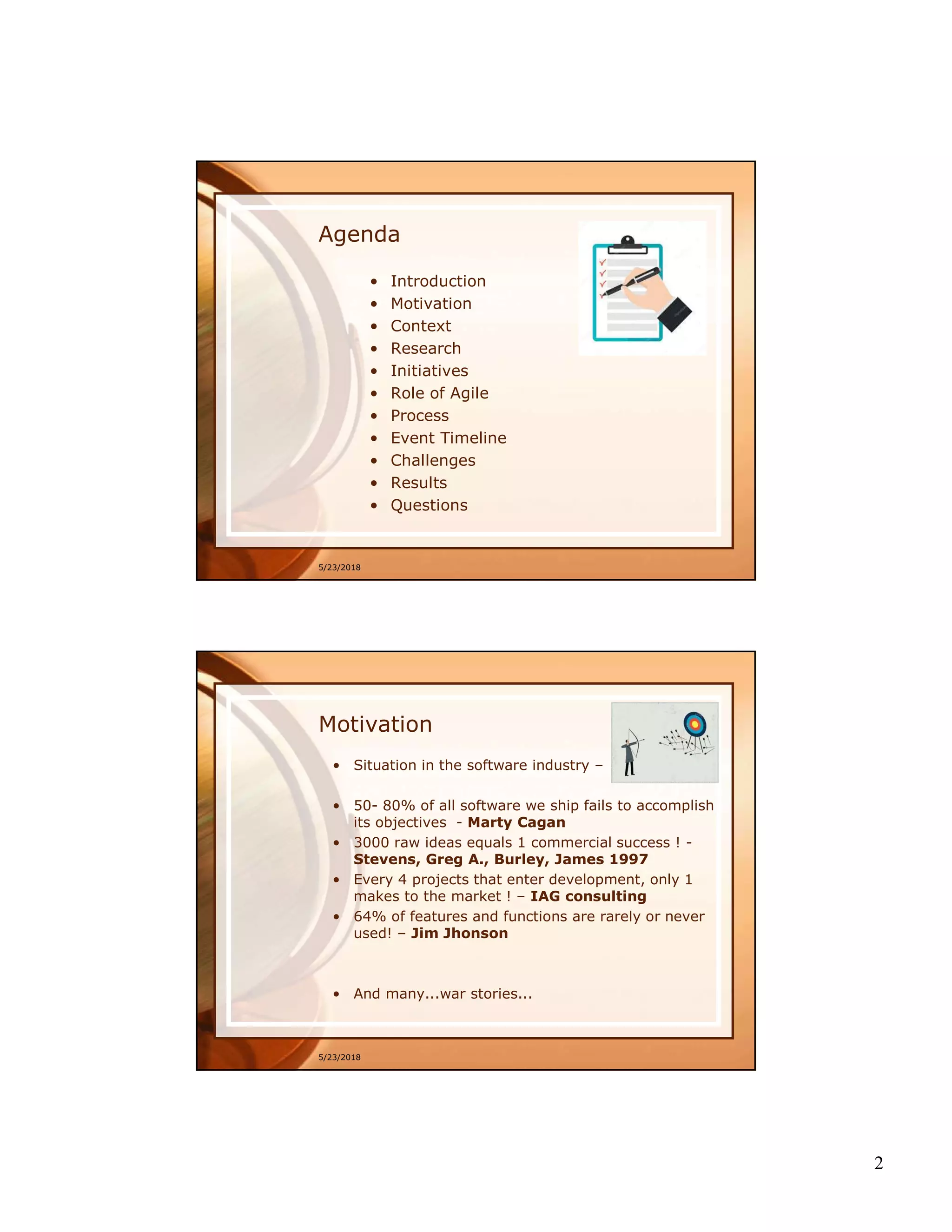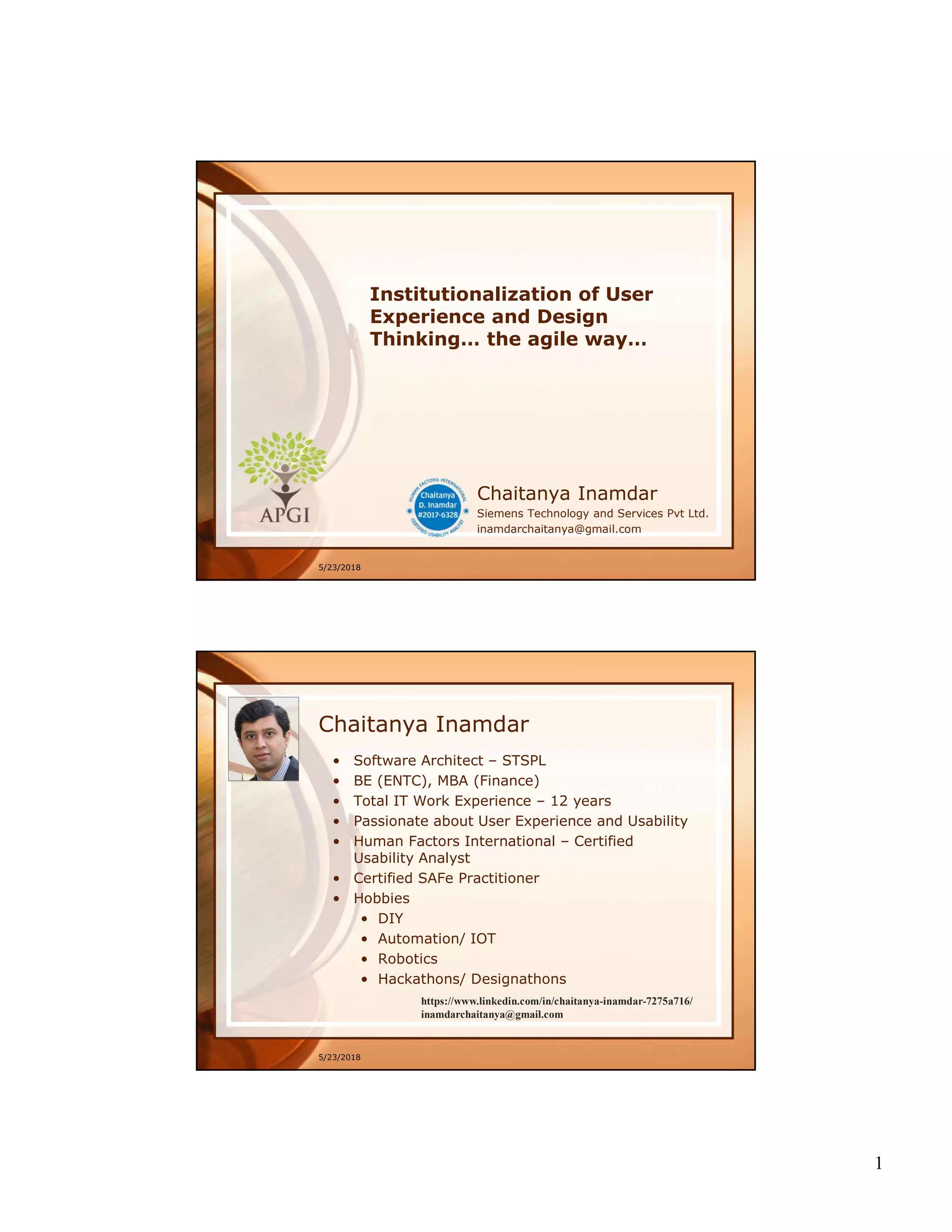 The document discusses institutionalizing user experience and design thinking approaches within an agile software development process at Siemens Technology and Services Pvt Ltd. Research found gaps in incorporating user and design perspectives in requirements. Initiatives were started to introduce UX processes and train people. An iterative UX process was developed aligned with SAFe principles. Over time, the process was formalized and supported more projects, and designathon events helped increase awareness and find champions. Further work is needed to standardize templates and fully institutionalize the approach.