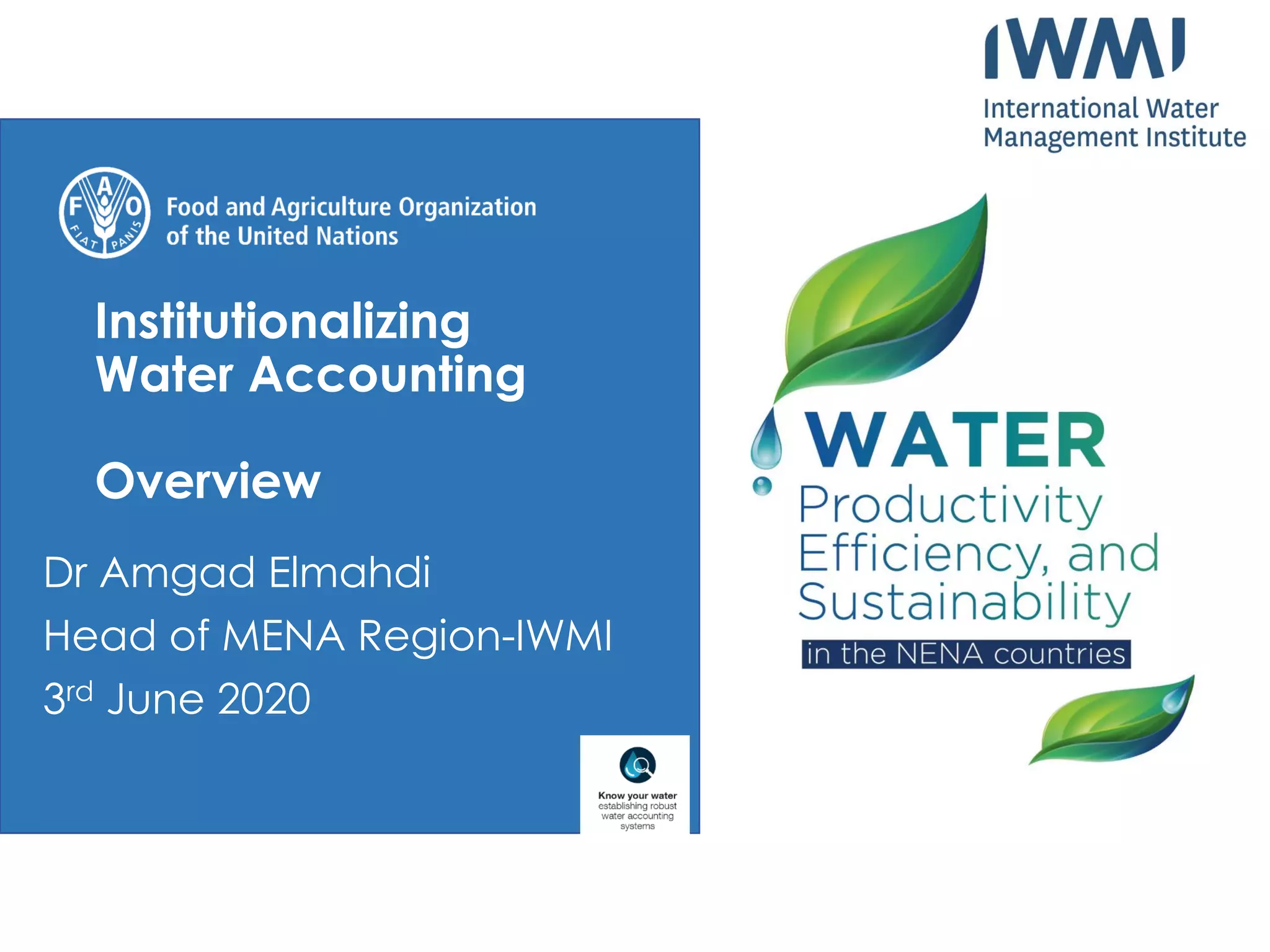This document discusses institutionalizing water accounting in order to better manage water resources. It provides an overview of the International Water Management Institute (IWMI), which conducts research on innovative water solutions. Water scarcity is a growing challenge in many regions. Water accounting can help fill information gaps and support decision making by regularly reporting on water availability, use, rights, and changes over time. It discusses elements like temporal and spatial scales to consider. The benefits of water accounting include increased transparency, comparable data to guide policies, and improved awareness. Institutionalizing water accounting requires establishing purposes, data sources, stakeholders, and aligning with existing policies and plans. It is a collective effort that can help answer key questions about water management and allocation.