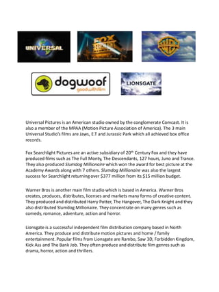 Universal Pictures is an American studio owned by Comcast that produced box office hits like Jaws, E.T. and Jurassic Park. Fox Searchlight Pictures is a subsidiary of 20th Century Fox that has produced award-winning films including Slumdog Millionaire, which won Best Picture and earned over $377 million on a $15 million budget. Warner Bros is a major American studio that has distributed films in many genres such as Harry Potter, The Dark Knight, and Slumdog Millionaire. Lionsgate is a North American independent studio known for drama, horror, and action movies like Rambo, Saw, and Kick Ass.