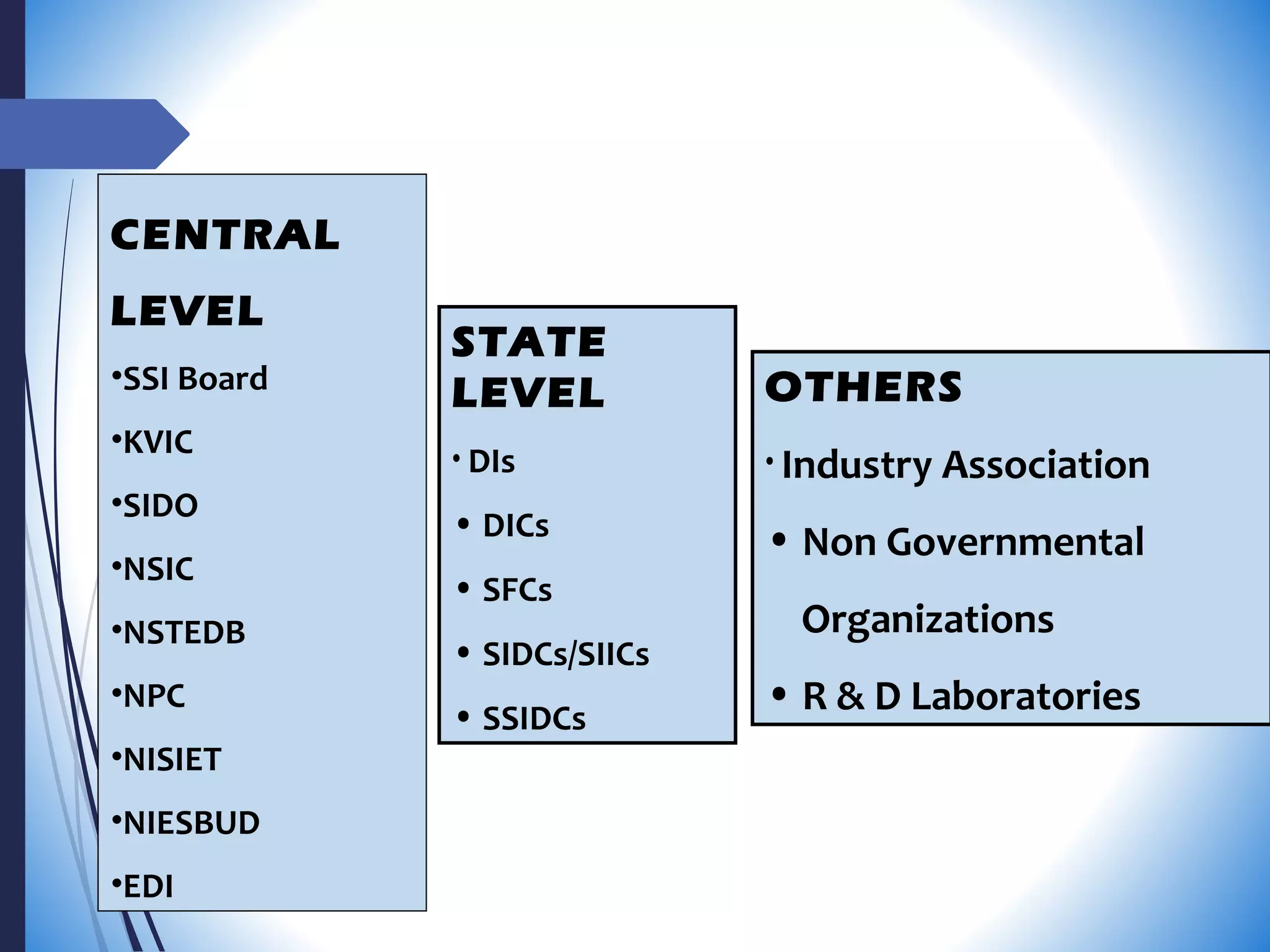 This document summarizes several organizations that support small and medium enterprises in India at both the central and state level. At the central level, organizations described include the Small Scale Industries Board, Khadi and Village Industries Commission, Small Industries Development Organization, National Small Industries Corporation, National Science and Technology Entrepreneurship Development Board, and National Institute for Small Industry Extension and Training. At the state level, organizations discussed are Directorates of Industries, District Industries Centers, State Financial Corporations, State Industrial Development/Investment Corporations, and State Small Industries Development Corporations. These organizations provide various services including finance, training, technology support, marketing assistance, and infrastructure development to small businesses.