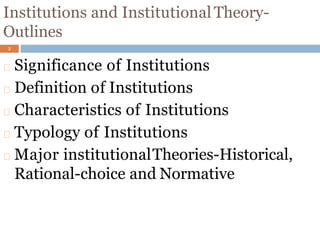 Historical institutionalism views institutions as enduring elements that develop gradually over long periods of time through path dependent processes. According to this perspective, institutions are shaped by their own unique histories and evolve along distinct trajectories that are difficult to alter. Once established, institutions tend to reinforce the status quo and resist change due to the high transaction costs involved in reforming or replacing them. Historical institutionalism examines how institutions form and evolve through incremental adaptations to changing social and political environments.