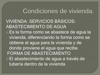 El documento describe las condiciones de vivienda y servicios básicos de una zona, incluyendo el abastecimiento de agua a través de tuberías, la eliminación de aguas servidas a través de alcantarillado público y el aumento en el uso de gas y electricidad. También menciona el Sistema de Incentivos para Vivienda que otorga subsidios a familias de bajos ingresos para comprar, construir o mejorar viviendas.