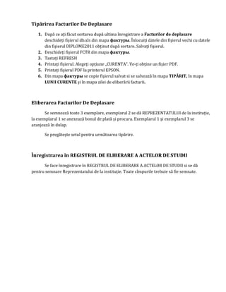 Documentul oferă instrucțiuni detaliate pentru completarea fișierului diplome2011 și pentru tipărirea facturilor de deplasare. Se specifică pașii necesari pentru înregistrarea și eliberarea actelor de studii, incluzând câmpurile care trebuie completate și modalitățile de salvare și imprimare a documentelor. De asemenea, se menționează importanța semnării tuturor exemplarelor emise și a înregistrării corespunzătoare în registrul de eliberare.