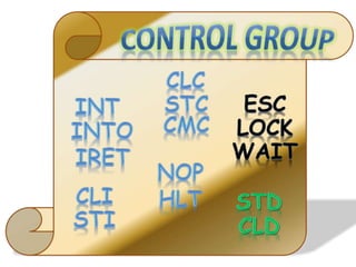 The document discusses interrupts in Intel 8086 microprocessors. It describes the INT instruction which causes an interrupt and transfers control to an interrupt service routine (ISR). It also describes the IRET instruction which returns from an interrupt by popping registers from the stack. Common interrupts and their associated service routines are discussed, including INT 10h for BIOS interrupts and INT 21h to stop a program.