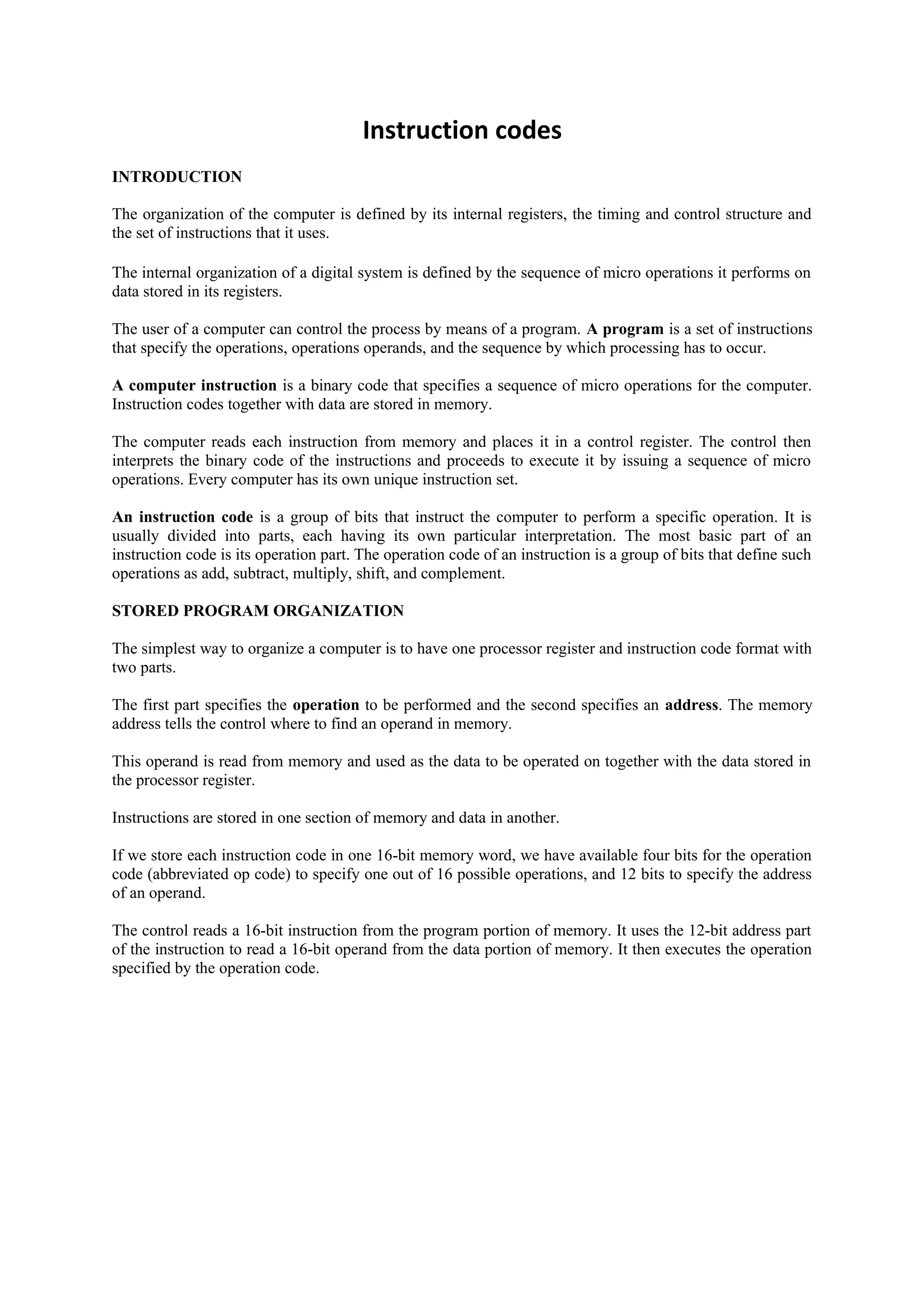 This document discusses computer instruction codes and the basic organization of a stored program computer. It describes how instruction codes specify operations for the computer to perform and are stored with data in memory. Each instruction is read from memory and placed in a control register to be executed. The document also outlines the basic registers used in a computer, including registers for holding instructions, data, memory addresses, and input/output. These registers are connected via a common bus system to transfer information between registers and memory.