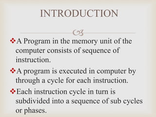 This document discusses the instruction cycle in a computer. It describes the four main phases of an instruction cycle: fetch, decode, execute, and write-back. It explains the fetch phase involves using the program counter to retrieve an instruction from memory and incrementing the program counter. The decode phase decodes the instruction using a decoder. The document provides details about the register transfers and timing signals involved in the fetch and decode phases. It also describes how the type of instruction, such as register reference, is determined during the instruction cycle.