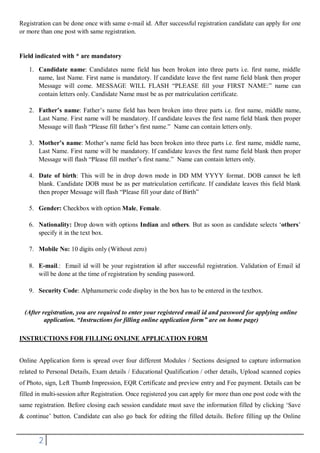 The document provides instructions for applying online for various positions at DRDO. It outlines the application process which involves registration, filling out an online form in multiple sections, uploading documents, and paying a fee (exempted for some categories). The form requests personal details, examination preferences, education and employment history. Documents like photo, signature, certificate, and license must meet size and format specifications. Details are previewed before final submission, at which point an application number is generated.