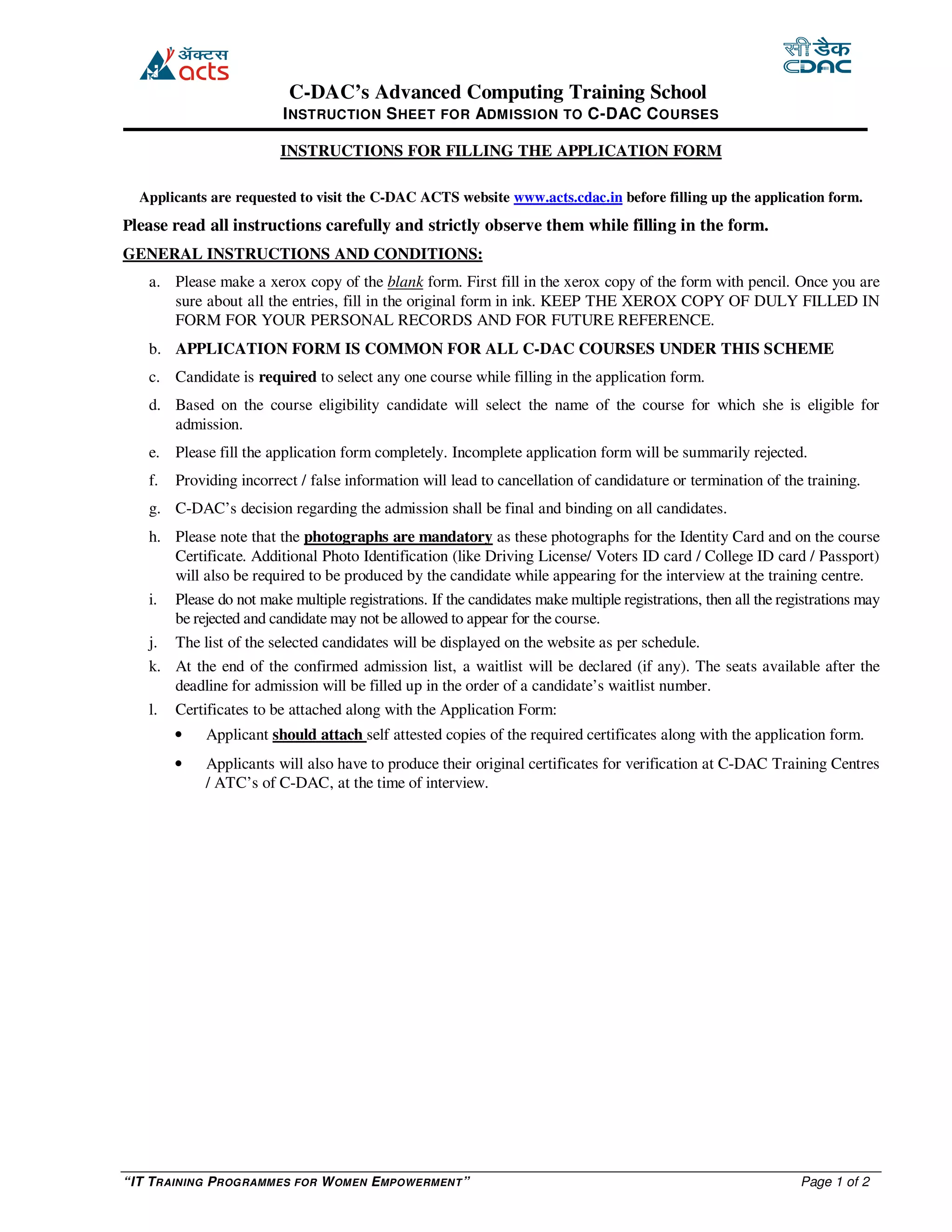 The document provides instructions for applicants applying to training courses offered by C-DAC's Advanced Computing Training School. It outlines the application process and requirements, including filling out a common application form, selecting one course based on eligibility, attaching required documents, and important dates. Applicants are instructed to read all directions carefully and provide complete and accurate information, as incomplete or false responses will lead to rejection or removal from the program. Selection decisions are final.