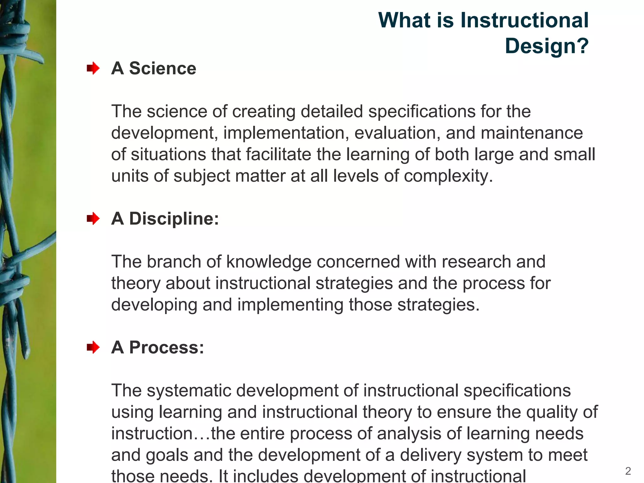 Instructional design is a science, discipline, and process that involves systematically analyzing learning needs, designing instructional experiences to address those needs, developing instructional materials, implementing instruction, and evaluating learning outcomes and the instructional process. Several instructional design models are presented, including the ADDIE model which involves analysis, design, development, implementation, and evaluation phases to create effective instruction that meets learners' needs. The document discusses tasks and outputs involved in each phase of the ADDIE model to illustrate the instructional design process.