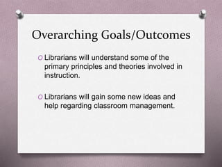 This document summarizes key points from a library instruction training session. It outlines goals for librarians to understand instruction principles and gain classroom management ideas. Objectives include recognizing teaching methods, sharing experiences, and discussing anxieties about teaching. The document then covers instructional design models and concepts like backwards design. It also discusses pedagogical approaches such as active learning, constructivism, and learner-centered teaching. Specific techniques are provided, like using videos to demonstrate effective and ineffective classroom management styles.