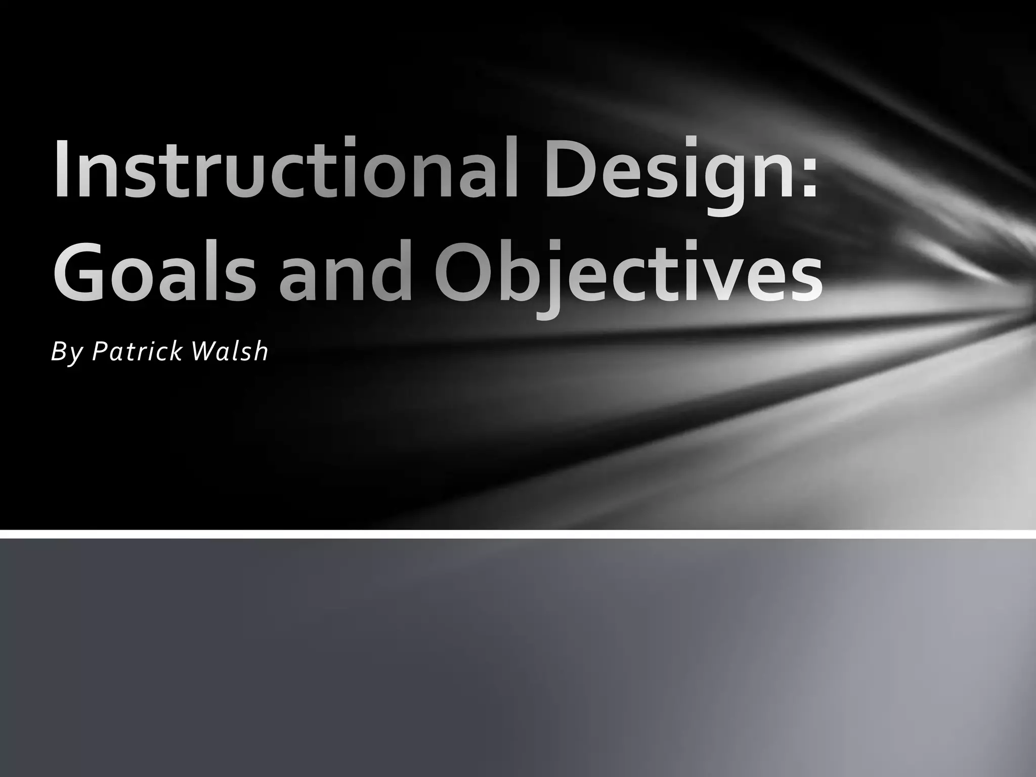 This document discusses the difference between goals and objectives for instructional design. Goals are broad statements of intended outcomes, while objectives specify how instruction will influence learners by describing what learners will be able to do under certain conditions after completing the instruction. The document outlines several models for writing effective objectives, including Mager's Performance Objectives and the ABCD method, and emphasizes using Bloom's Revised Taxonomy to specify the cognitive level required by the objective.