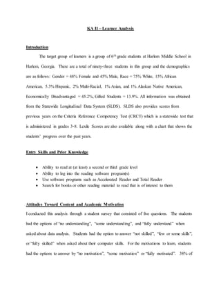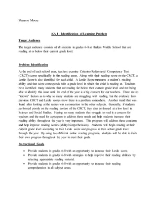 The document provides information on identifying a learning problem and target audience for an instructional plan. It discusses a problem identified by teachers at Harlem Middle School, where many 6th-8th grade students are reading below grade level. Two online reading programs will be used to help students increase their Lexile scores, which measure reading ability, and improve their reading comprehension. The instructional goals are to provide opportunities for students to increase their Lexile scores, learn reading strategies, and boost comprehension in all subjects.