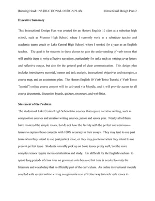 This instructional design plan aims to teach honors sophomore students advanced verb tenses through an online tutorial. The tutorial will review basic verb tenses and teach present continuous, present perfect, past continuous, past perfect, and future verb tenses. Students will practice identifying verb tenses in writing examples and applying various tenses correctly in a sample cover letter. The goal is for students to effectively communicate through accurate use of verb tenses in their own narrative writing.