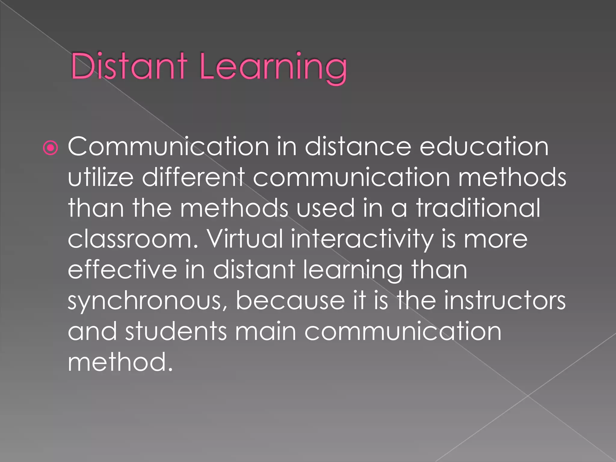 This document discusses different principles of effective instructional design for distance education. It explains that communication in distance learning relies more on virtual methods like asynchronous communication rather than synchronous. It emphasizes that learning occurs when the content taught matches the content learned, and skills are demonstrated along with guidance relating specific examples to general principles. Effective demonstration also engages learners and uses relevant media. The document outlines that application of skills is most effective with intrinsic or corrective feedback, and coaching that is later faded out. It stresses integrating a variety of delivery methods and technologies to provide feedback and interaction for students.