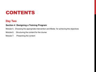 This document provides an agenda and content for Day 2 of a 2-day training program on designing training programs. The document outlines modules on choosing appropriate media and delivery methods, structuring content, and presenting content. It discusses dividing content into units, setting an overall structure, and considerations for opening, closing and delivering lectures. The goal is to provide trainers with tools and best practices for designing effective training content and experiences.