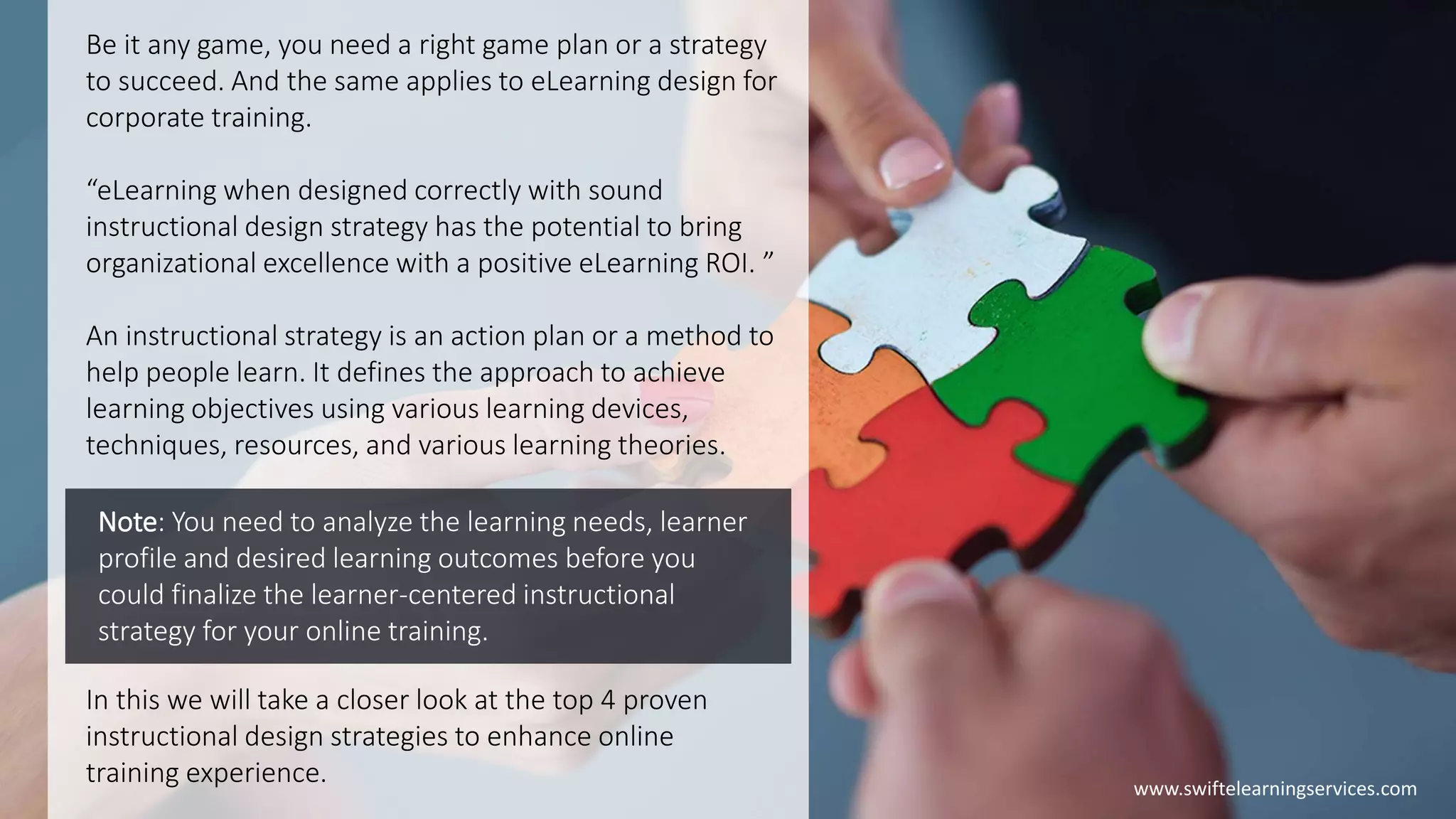 The document outlines four proven instructional design strategies to enhance elearning for corporate training: story-based learning, scenario-based learning, microlearning, and gamification. Each strategy emphasizes engaging learners through relatable narratives, real-life scenarios, concise content delivery, and game-design techniques to improve knowledge retention and performance. The importance of analyzing learner needs and desired outcomes is highlighted before selecting the appropriate instructional strategy.