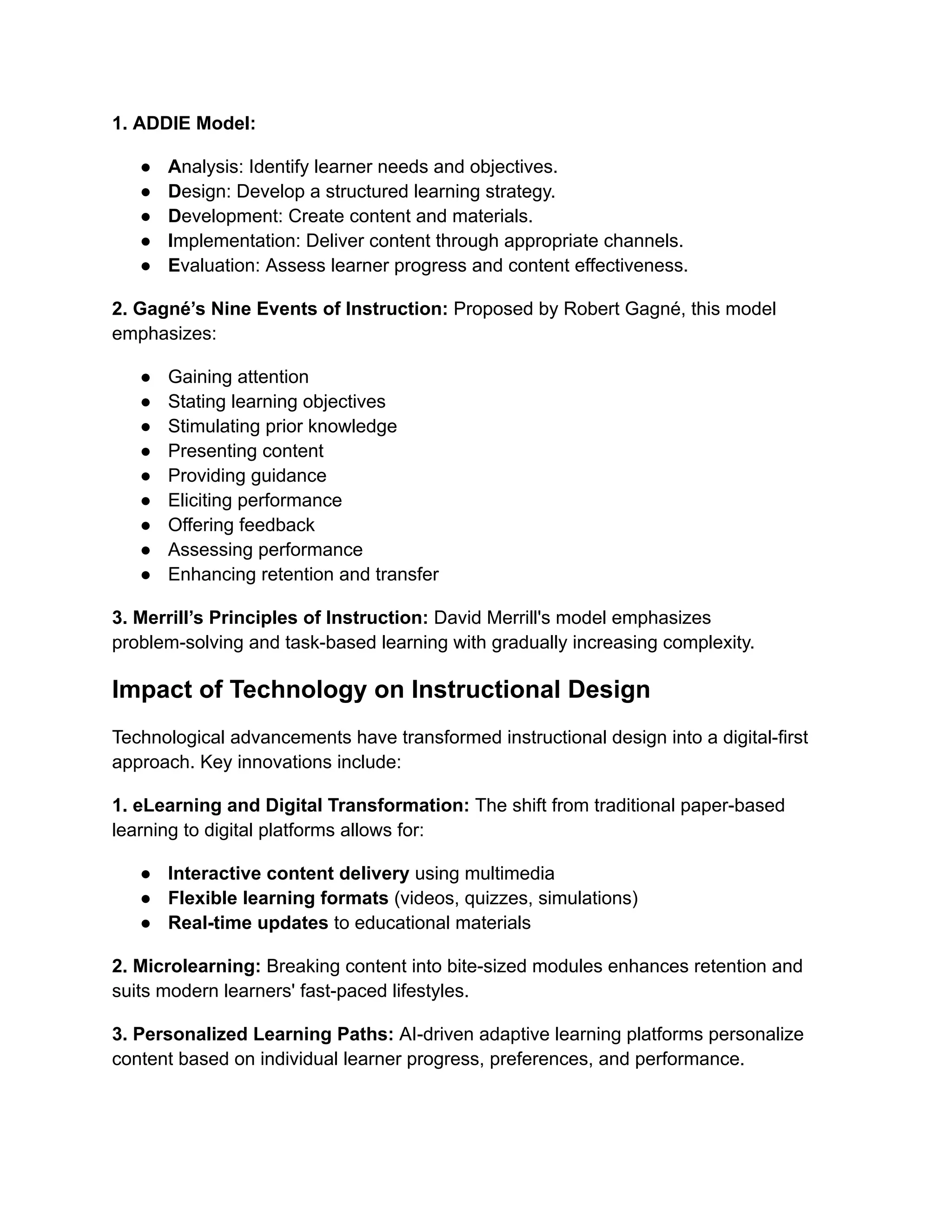 The document discusses the evolution and significance of instructional design in education and corporate training, highlighting its systematic approach and reliance on technology. It details key models like ADDIE and Gagné’s Nine Events, emphasizes the impact of AI and digital tools on learning personalization and engagement, and outlines best practices for implementing AI effectively. Ultimately, it positions AI as a transformative force in instructional design, enhancing learning outcomes and experiences.