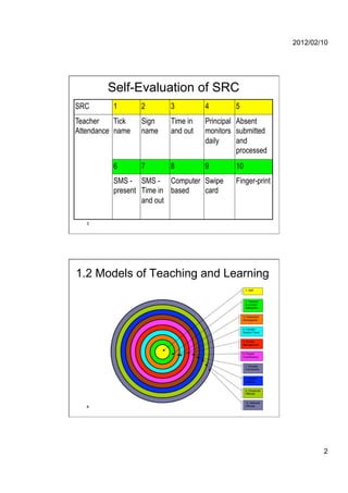 The document provides information on instructional leadership and the learning organization. It discusses topics such as teacher attendance monitoring systems, models of teaching and learning, Peter Senge's five disciplines of a learning organization, characteristics of a learning organization, and components and assessment of learning outcomes. The presentation aims to help change current practices to attain quality education for all learners. It emphasizes the importance of systems thinking, personal mastery, mental models, shared vision, and team learning in developing a successful learning organization.