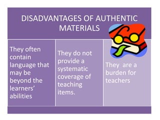 Teaching materials play a key role in language programs by serving as a resource for presenting grammar, vocabulary, and pronunciation concepts to learners. They also provide stimulus for classroom activities and support less experienced teachers. While authentic materials capture real language usage, created materials can be tailored to fit learning objectives; teachers should consider both in balancing authenticity with meeting curriculum needs.