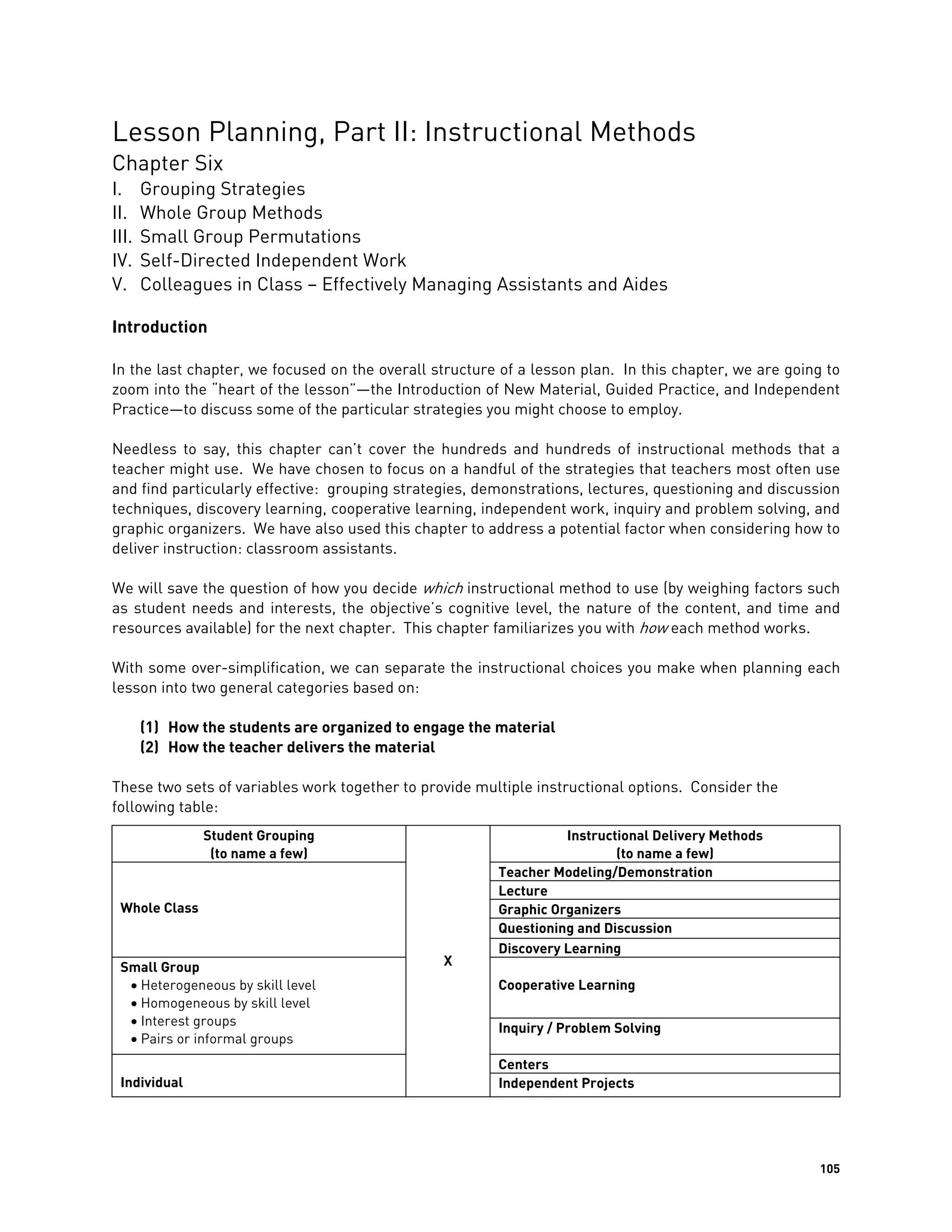 This document discusses various instructional methods that teachers can use when planning lessons. It describes grouping strategies like whole class, small groups, and individual work. It then focuses on some common instructional delivery methods used with whole groups, including modeling/demonstration, lecture, and graphic organizers. For each method, it provides examples, tips, and potential pitfalls. The document emphasizes the importance of selecting instructional methods based on student needs, objectives, content, and available time/resources.