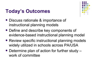 The document discusses instructional planning models and their importance for school districts. It defines instructional planning models as frameworks that guide curriculum, instruction, assessment, and school organization to increase student achievement. The document reviews several specific models, including Understanding by Design (UBD), Dimensions of Learning (DOL), and Learning Focused Schools (LFS). It discusses establishing a committee to review models and determine the best approach for the Methacton School District.