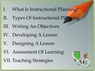 The document discusses instructional planning for teaching. It covers types of instructional planning like course plans, unit plans, and lesson plans. It also discusses developing objectives, designing lessons, and assessing student learning. Some key teaching strategies discussed include lecture, discussion, demonstration, debate, role playing, and simulation. Effective instructional planning is important as it helps teachers logically sequence lessons, develop comprehensive learning experiences, and guide students.