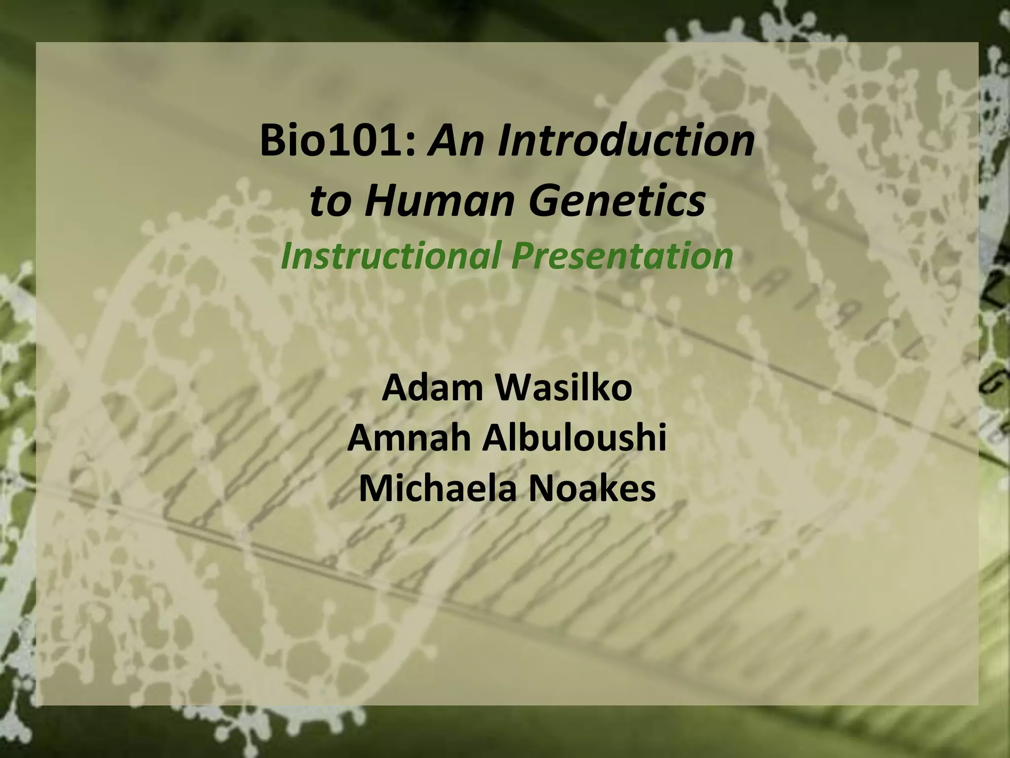 This document provides an introduction to human genetics. It discusses the basics of genetics including how traits are passed from parents to offspring. It covers Gregor Mendel's pioneering experiments with pea plants which laid the foundations of genetics. Key terms like genes, alleles, dominant/recessive traits, genotypes and phenotypes are explained. Mendel's laws of inheritance are outlined. The document discusses variations like codominance and incomplete dominance. It assigns students a research project to investigate genetic diseases and their inheritance patterns. Overall, the document serves as an overview of basic genetics concepts.