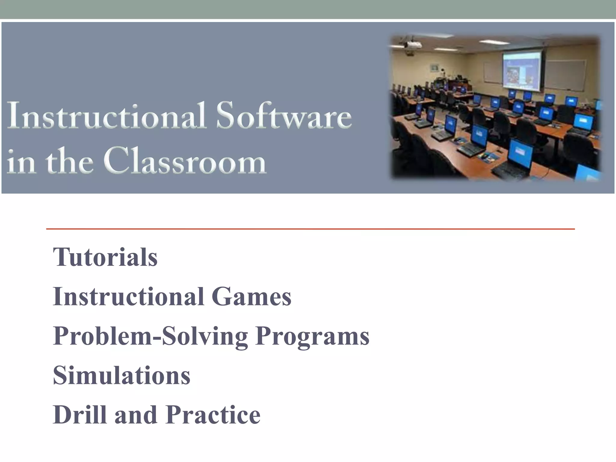 This document discusses different types of instructional software: tutorials, instructional games, problem-solving programs, simulations, and drill and practice programs. Tutorials break skills into subsections that build on each other. Instructional games add rules to engage learners and require higher-level thinking. Problem-solving programs promote analysis through immersive virtual environments. Simulations create authentic learning experiences. Drill and practice improves performance through repetitive tasks and immediate feedback. Resources for evaluating each type are provided.