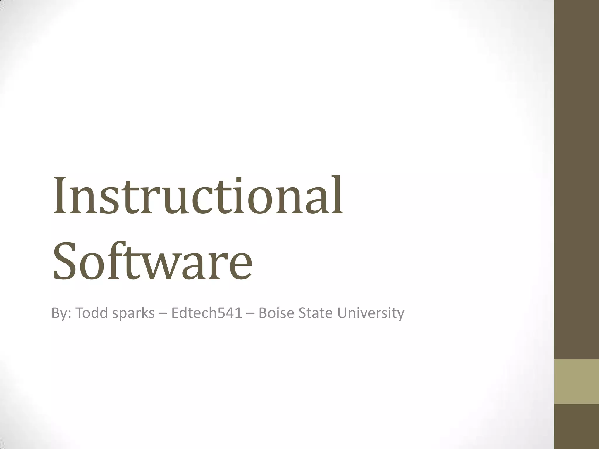 The document discusses different categories of instructional software including drill and practice software. Drill and practice software allows users to practice solving problems with examples and receives feedback on answers. Examples provided are flashcards, branching drills, and activities with extensive feedback. Benefits of drill and practice software include opportunities for repetitive rehearsal to improve long term memory, immediate feedback, motivation, and time savings for teachers. Websites listed provide math and writing practice programs as examples.