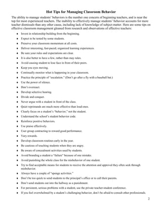 The document discusses establishing clear classroom routines and procedures. It emphasizes that routines are necessary to ensure a smoothly run classroom. Students must understand what is expected of them. The document provides a list of potential routine times, such as entering/exiting class, turning in assignments, getting attention, and more. It stresses discussing the importance of routines with students and allowing them to help create procedures. When establishing routines, teachers should model, allow practice, and not overwhelm students. Routines may need revisiting throughout the year.