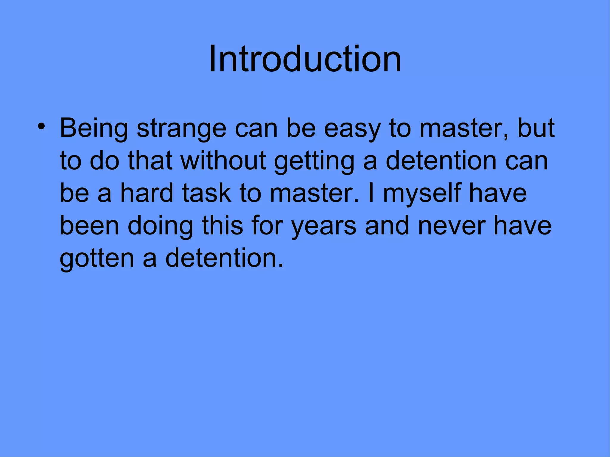 The document provides tips on how to be strange in class without getting a detention. It recommends starting by being mildly strange with strict teachers and gradually increasing the strange behavior with more laidback teachers. Key tips include having fun, using appropriate randomness, learning from mistakes, and avoiding going overboard or acting in a way that requires mental health care. Examples given are responding to wins or requests from teachers with made-up phrases. The goal is to be entertaining but not disruptive enough to warrant disciplinary action.
