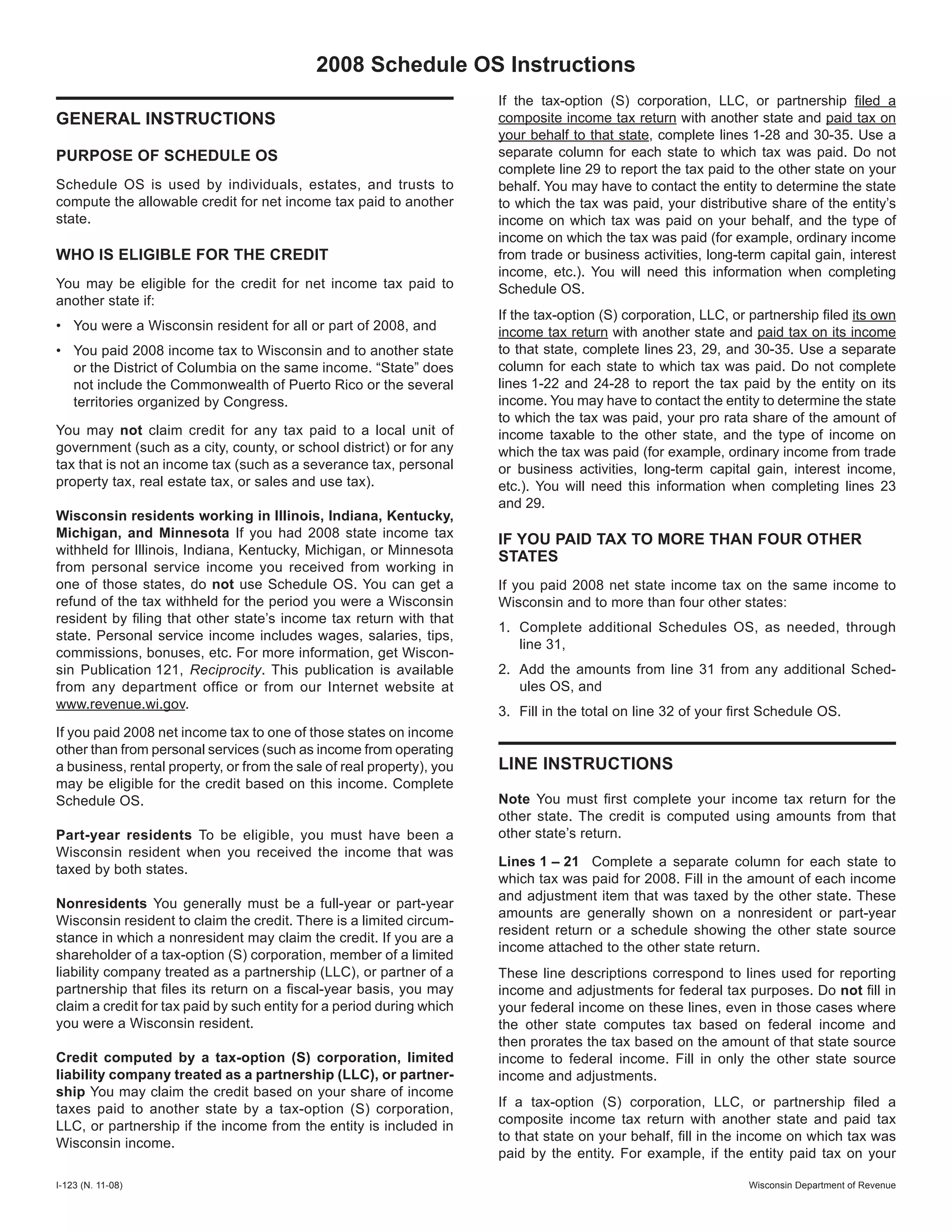 This 3 sentence summary provides the essential information from the document: The document provides instructions for completing Schedule OS to claim a credit for net income tax paid to another state. It explains who is eligible for the credit and how to calculate the credit amount based on income and taxes paid to the other state. The instructions include details on reporting income and tax amounts for different filing situations, such as composite returns filed by partnerships.