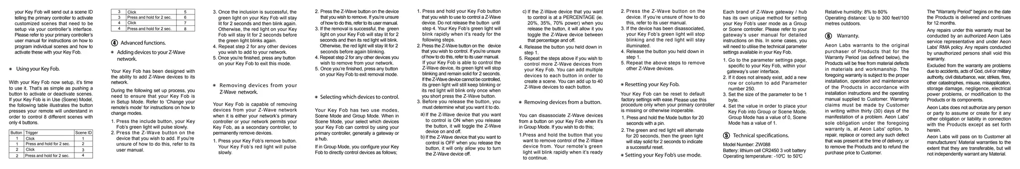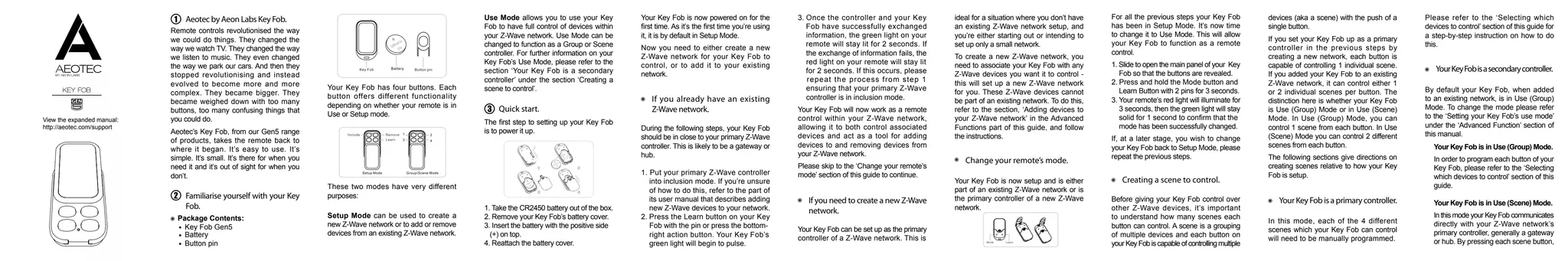 The document provides instructions for setting up and using an Aeotec by Aeon Labs Key Fob Z-Wave remote control. The Key Fob has four buttons and can be used to control Z-Wave devices in either Setup Mode or Use Mode. In Setup Mode, the Key Fob can add or remove devices from a Z-Wave network, while in Use Mode it functions as a remote control. The instructions outline how to power on the Key Fob, change between modes, add it to an existing Z-Wave network or set it up as the primary controller, and program the buttons to control scenes of connected devices.