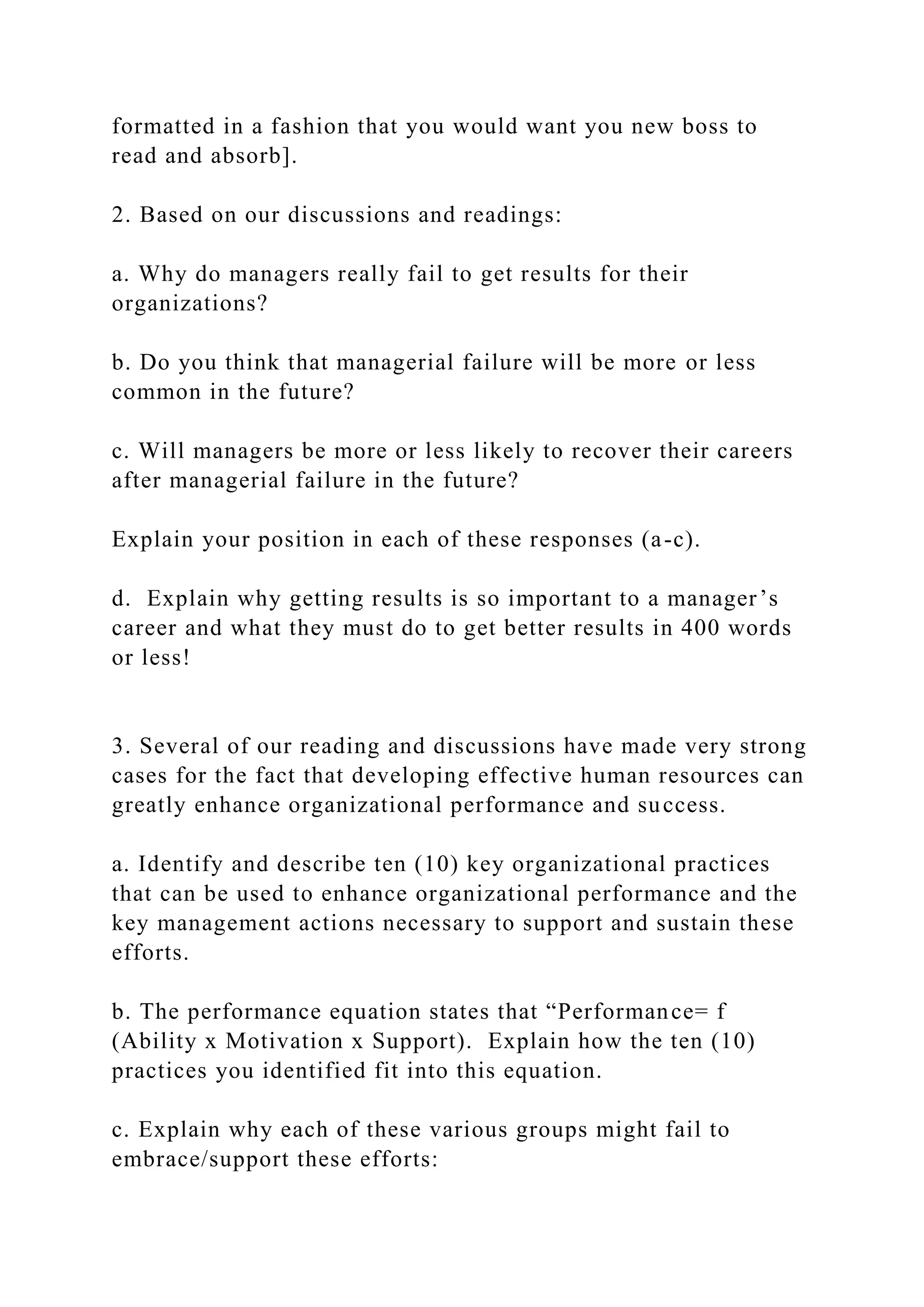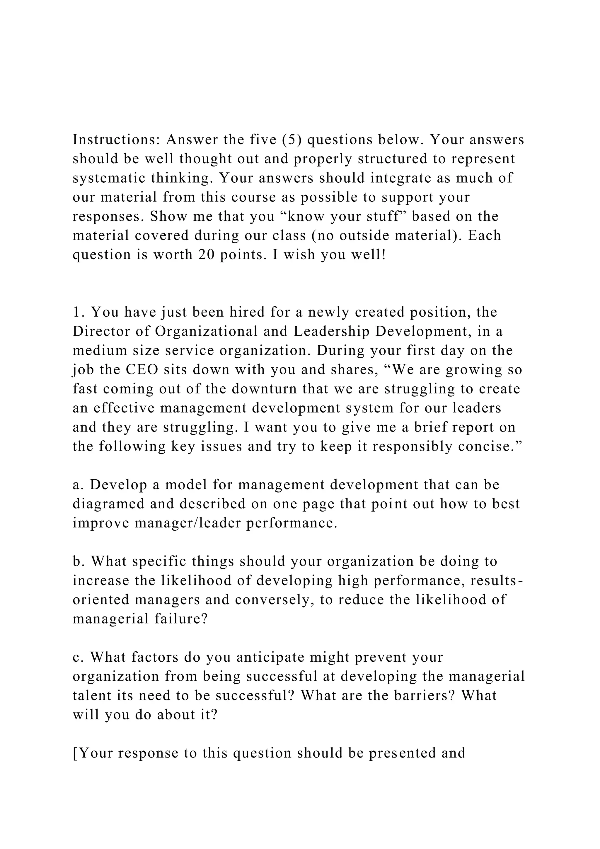 The document is an instructional guide for a course assignment, outlining five questions for students to analyze regarding organizational leadership and management development in a service organization. It emphasizes the need to incorporate course material, provide structured responses, and address key issues such as improving manager performance, developing high-performance managers, and navigating potential barriers. Students are expected to present their findings clearly and concisely, demonstrating their understanding of the course content.
