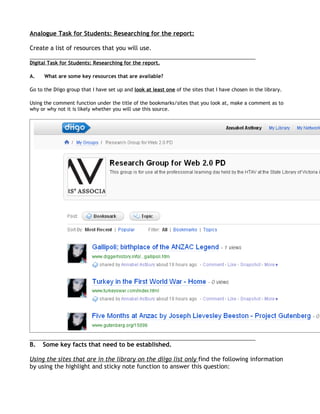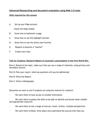 This document outlines tasks for students to research Australia's participation in World War 1 using the Diigo web annotation tool. It provides instructions on setting up a Diigo account and how to bookmark, highlight, add sticky notes and comments. Students are asked to research the topic, plan their report, write the report and bibliography. The document discusses wanting students to access reliable sources, identify resources, use a range of sources, and understand what they read. Students are given digital and analogue tasks to make lists of resources and find key facts to answer a question using Diigo annotations. They are also asked to add resources to the Diigo library with descriptions and tags. The document explains using sticky notes to comment on specific pages and direct